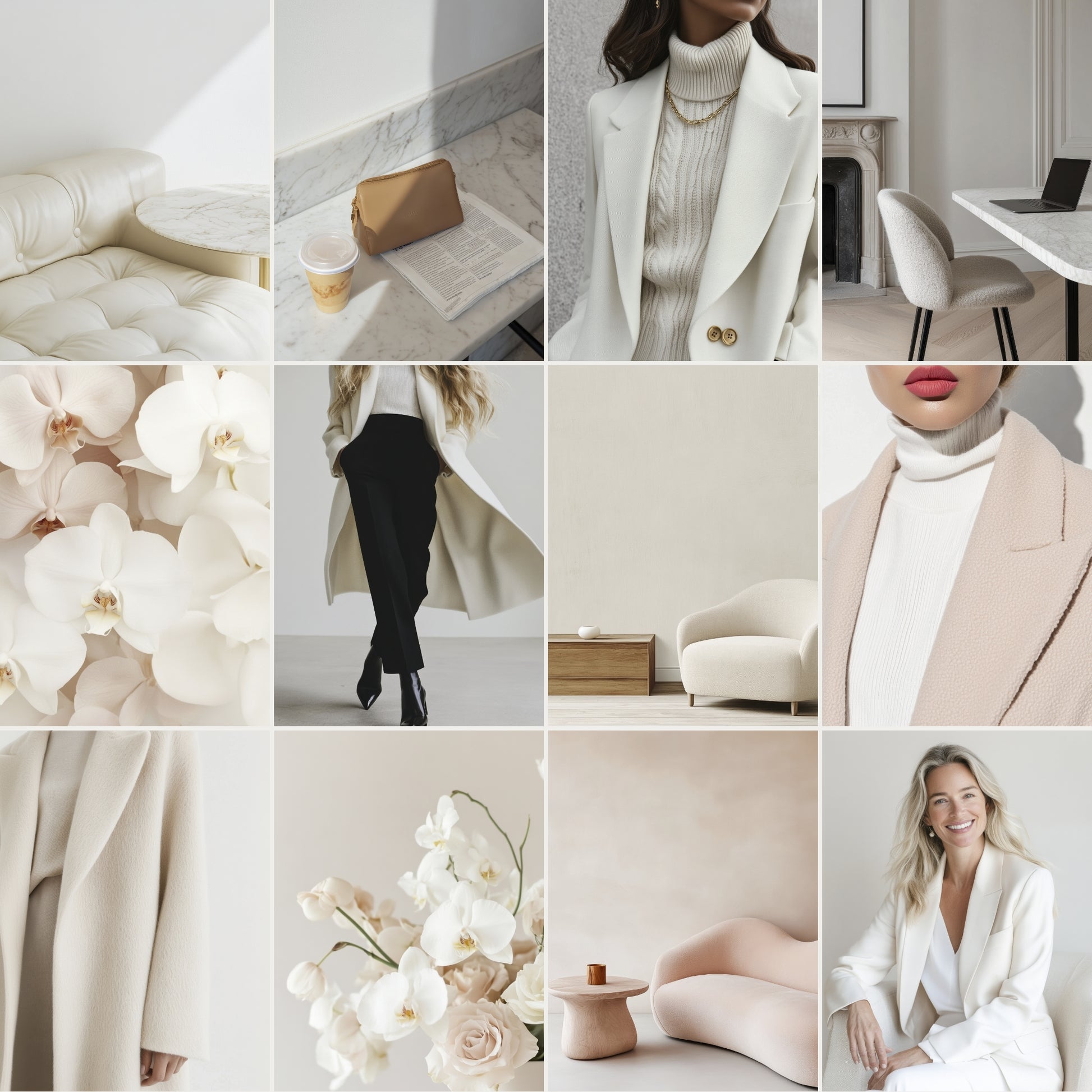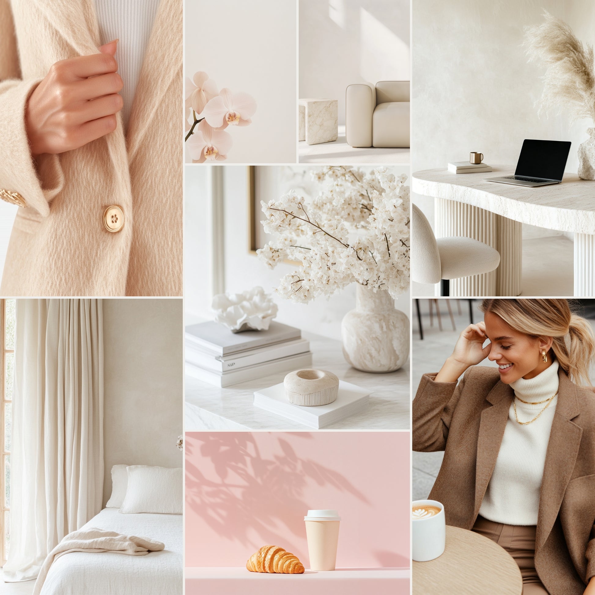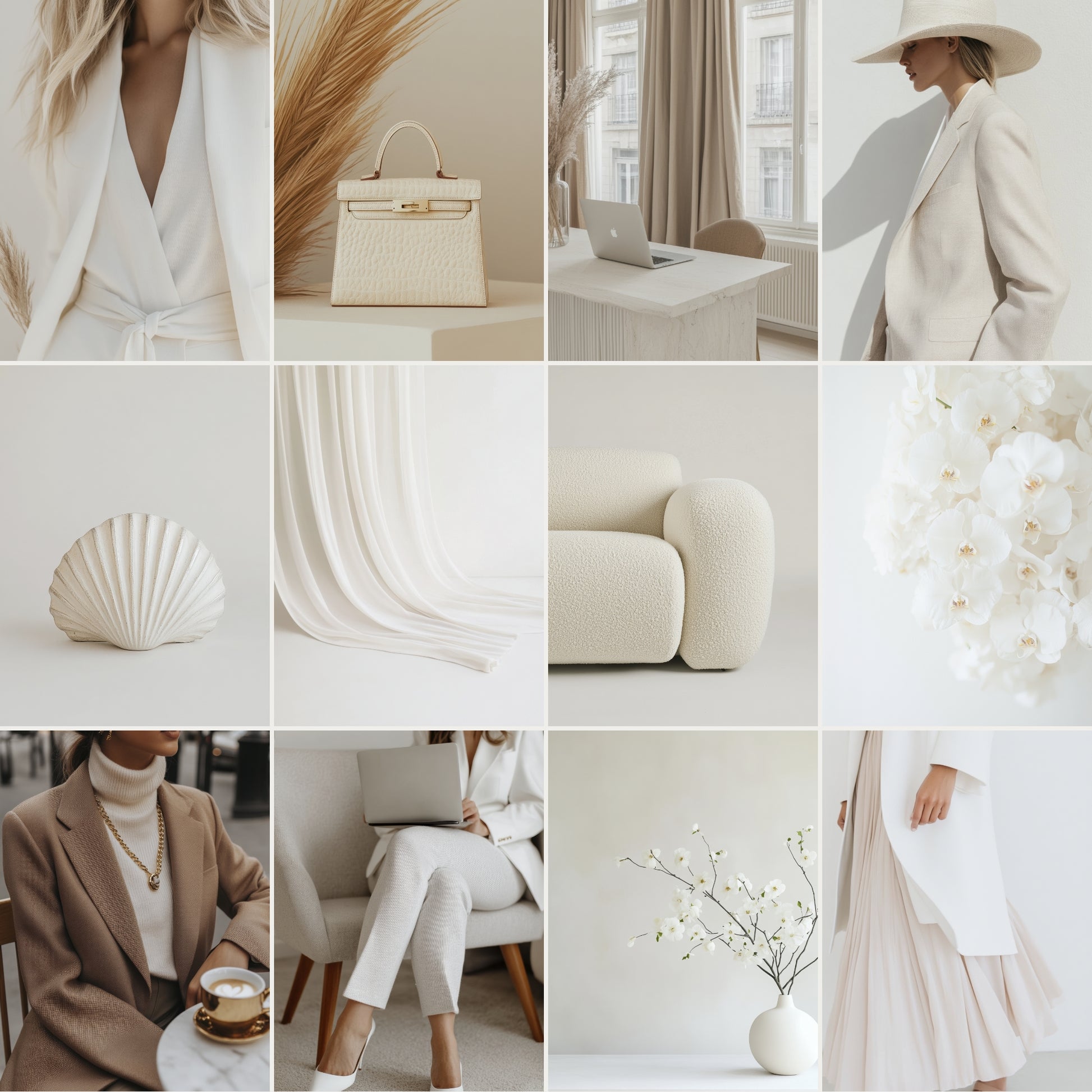 Embrace the minimalist charm with a palette of soft neutrals and warm tones, perfectly capturing the essence of contemporary femininity. Each image is a harmonious blend of clean lines and gentle curves, creating a serene yet powerful visual narrative.